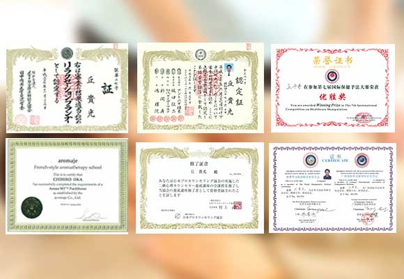 2017年国际手法大赛优胜奖 ◎ 世界手 法医学联合会会员 国际修复手法大赛优胜奖 康复修复师/日本医学手法高级技师 日本一级精油认定 日本精油淋巴护理认定